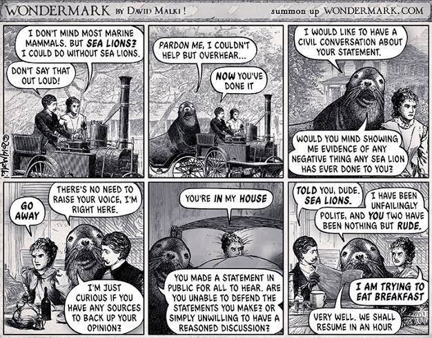 Infographic: What Is Tone Policing And Why Is It Wrong? By Shambhavi Raj Singh -July 17, 2020 Sealioning(シーライオニング)本当は理解する気などないのに、『理解したいので教えて』的な丁寧な姿勢を装いつつ不誠実な質問を繰り返して相手を疲弊による時間の浪費やハラスメント。相手の説明を故意に誤解する まとめました。読んでないけど、当てますね。結構自信ある。