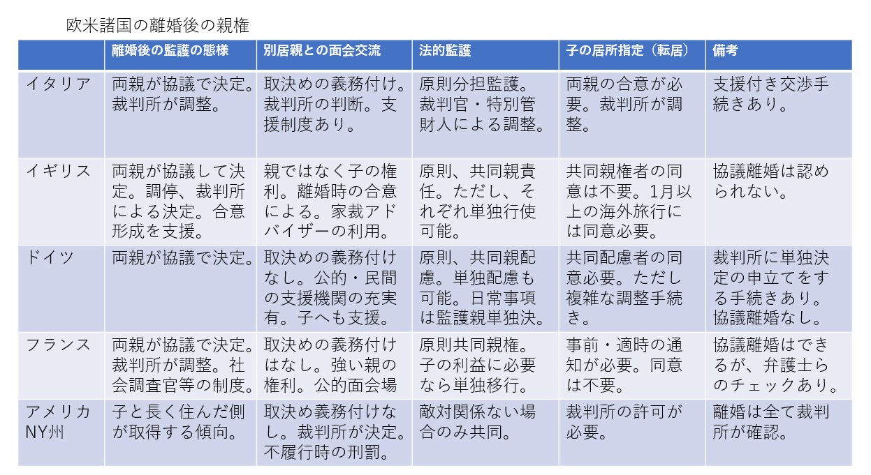海外では、父母の調整にあたる相談役や裁判官が日本よりもはるかに多くいたり、公費で弁護士に相談できたりする制度もある。「海外では」というなら、親権の部分だけでなく、そうした制度も比較せねばならない。