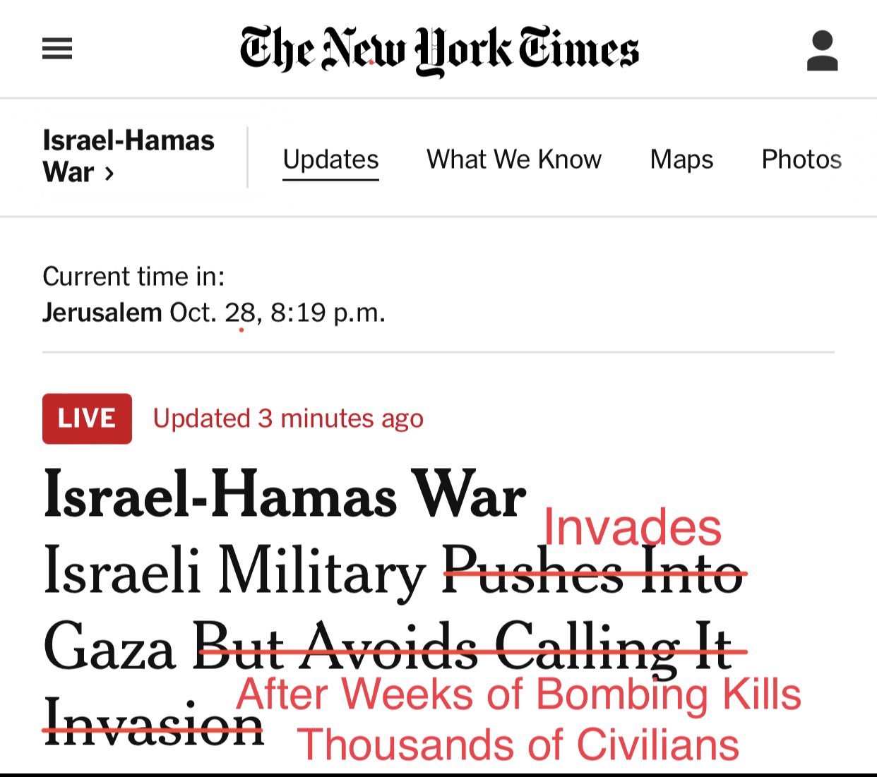 日本の右翼の歴史教科書みたいなことやっているんだ、NYTは?After a horrific night with no communication to know the level of destruction and death in Gaza, this is the NYT headline. “But avoids calling it an invasion.” What do you call it? Oh yes, a “push” pic.twitter.com/ulVM49XvCD